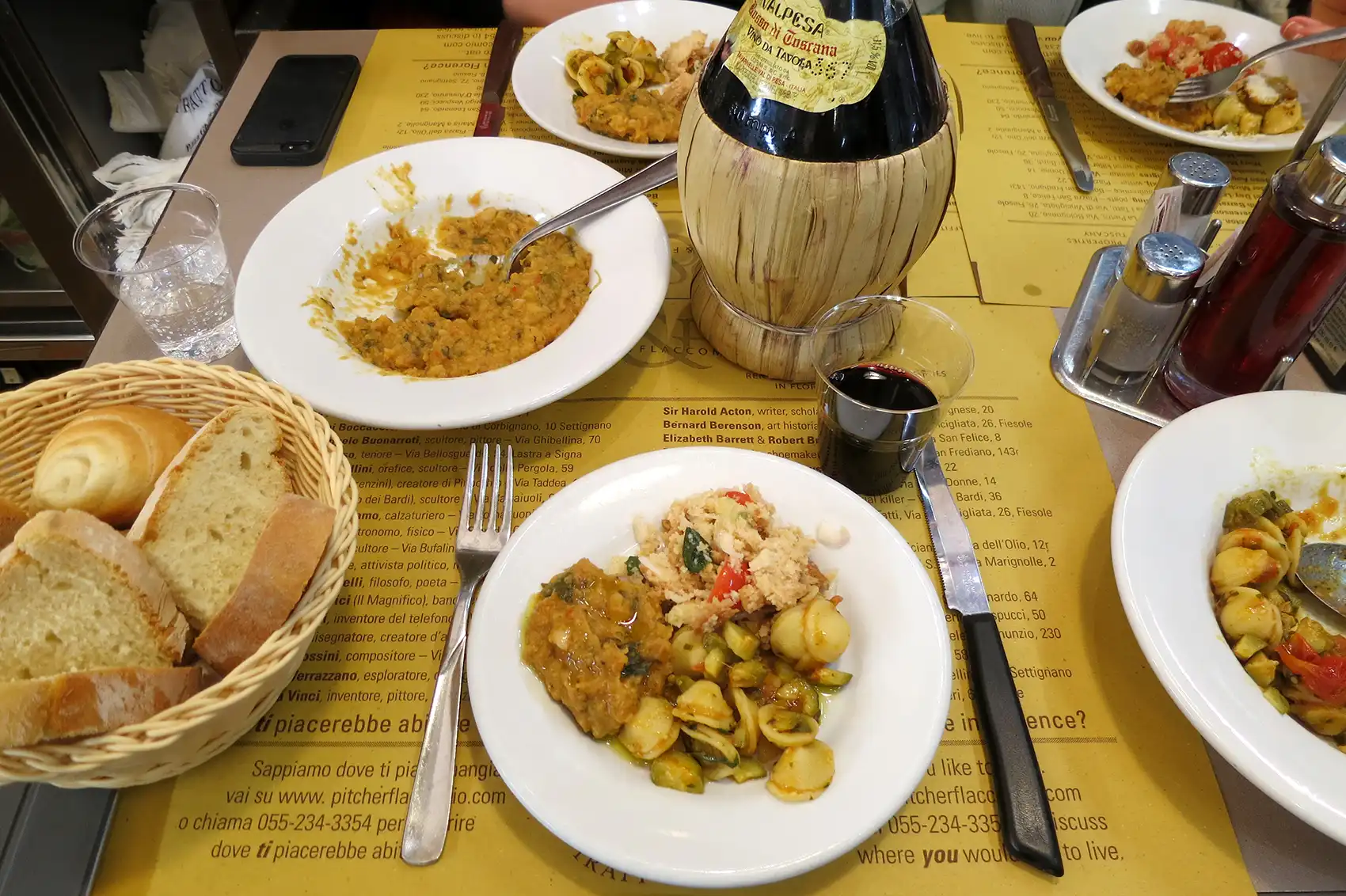 Vào các buổi tối, thực đơn có vẻ tinh tế và phong phú hơn, nhưng giá vẫn ở mức thấp đáng kể với các món ravioli (pasta có nhân cuốn bên trong) nhồi với pho mai ricotta và các loại thảo mộc hoang dã tan chảy trong bơ, cơm risotto và phi lê áp chảo thịt bò Fassona từ vùng Piemonte. Các loại rượu vang cũng vô cùng tuyệt vời, trong đó có I Veroni từ Rufina, phía đông của Florence, với giá khoảng 12€ (300.000vnd) cho một chai rượu. Bữa tối 2 món không bao gồm đồ uống khoảng €20 (450.000vnd).