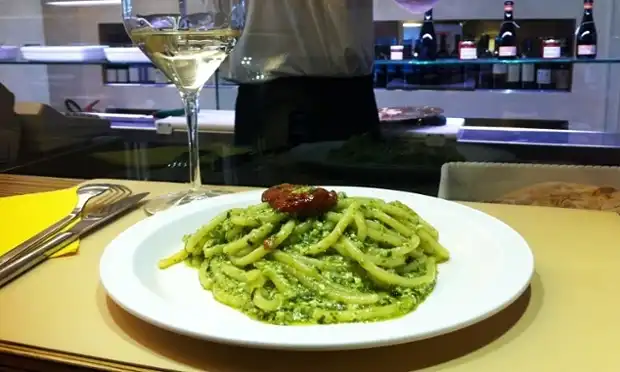 Thực khách có thể ngồi quanh quầy ăn, nơi Alberto Navari và mẹ của anh, bà Giuseppina, xem họ chế biến các món ăn tuyệt vời trong ngày như món mì ống cappellacci nhồi với pho mai pecorino và lê hoặc mì taglierini với nấm đen tươi. Bạn cũng sẽ bị cám dỗ bởi món melanzane alla parmigiana (cà tím nướng với pho mai), bò hầm cay cùng với các món rau theo mùa và các món tráng miệng tuyệt vời. Có nhiều sự lựa chọn rượu vang hấp dẫn.