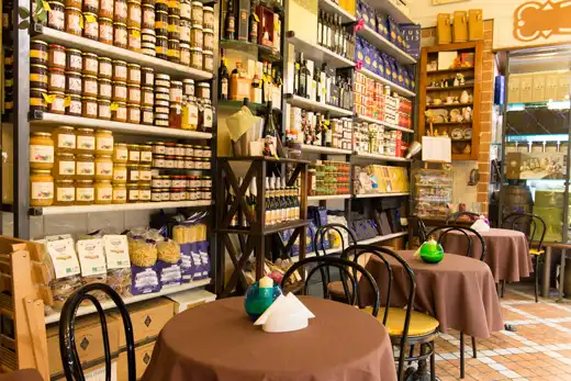 Trên kệ đầy ắp mứt và mật ong, giấm balsamic (một loại dấm được ví như hàng “quý tộc” được kết tinh từ nho đỏ, mật ong và lựu), dầu ô liu, mì ống, bánh quy homemade và rượu. Đây cũng là một nơi tuyệt vời cho một bữa ăn trưa nhanh chóng. Du khách có thể lựa chọn các món mì ống tươi và các món chính thay đổi hàng ngày chỉ từ €6 (khoảng 150.000vnd). Món ăn hỗn hợp của các loại thịt và pho mát có giá từ 8€ (khoảng 200.000vnd). Nguyên liệu phần lớn được cung cấp theo mùa, từ các trang trại riêng của gia đình.