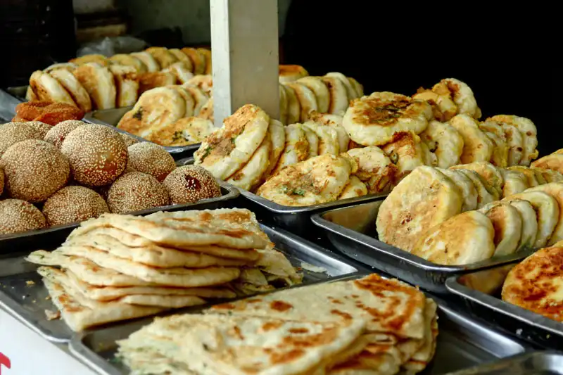 Nếu muốn thưởng thức bữa sáng truyền thống đúng kiểu, hãy lựa chọn bánh kếp hành lá để bắt đầu một ngày của bạn. Ngoài ra bánh rán vừng, bánh hấp vị mặn, ngọt cũng rất hấp dẫn. Món bánh chiên có vị giòn, dai này được bán rất nhiều ở các tiệm ăn đường phố, đặc biệt là ở đường Xiangyang, vốn rất nổi tiếng với các quầy bán đồ ăn sáng.