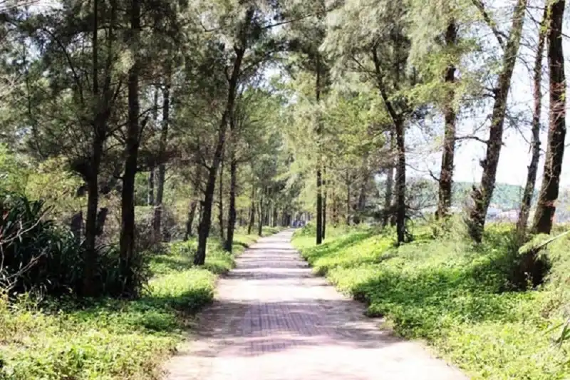 Con đường tình yêu trên đảo Cô Tô Con đường dài hơn 2km được lát gạch đỏ, men theo bờ biển, 2 bên là 2 hàng dương xanh ngắt, lay theo gió. Gọi là con đường tình yêu cũng đúng khi cảm giác đi dạo ở đây, dù đi bộ, hay đạp xe chầm chậm, đều vô cùng lãng mạn. Tiếng hàng dương vi vu, tiếng sóng biển rì rào, gió dịu nhẹ mơn man, cảnh trước mắt xanh ngắt màu của rừng cây, vàng của ánh nắng, và đỏ của gạch lát, không thua gì trong các bộ phim truyền hình lãng mạn Hàn Quốc.