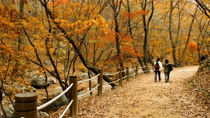 Vẻ đẹp của Seoraksan làm khách choáng ngợp quanh năm, đặc biệt hơn cả vẫn là mùa thu, khi núi rực rỡ sắc màu tự nhiên nhất. Du khách có thể lên kế hoạch thực hiện những chuyến đi bộ, tới các điểm ngắm lá đổi màu như thung lũng Cheonbuldong, suối khoáng Osaek, Osaek Jujeongol và thung lũng Baekdam.