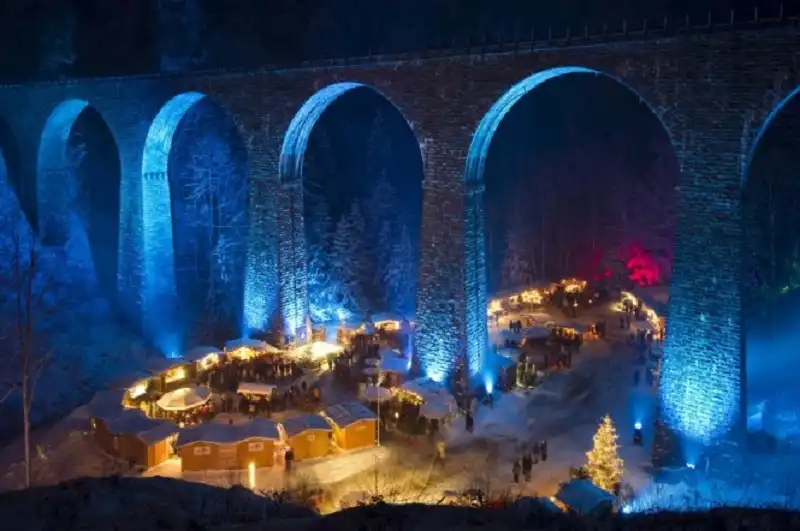 Nằm giữa lòng rừng Đen, phía Nam bang Baden-Baden của Đức với những cây thông cao to xung quanh, là ngôi chợ Giáng Sinh dưới cầu duy nhất trên thế giới. Dưới cầu cạn đường sắt Höllentalbahn cao 40m là hơn 40 lều gỗ bày bán sản phẩm thủ công mỹ nghệ địa phương. Từ 16h30, khu chợ trở nên huyền ảo hơn dưới ánh sáng lấp lánh viền quanh hình dáng cầu cạn chuyển màu theo mỗi giờ.