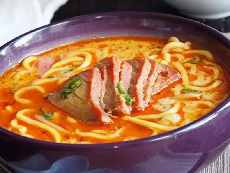 Laksa hay còn gọi là cà ri laksa, được biết đến là món ăn ngon nổi tiếng của cả 2 quốc gia Malaysia và Singapore. Với công thức chế biến đặc biệt, Laksa là sự kết hợp của các nguyên liệu như: mì sợi, chả cá, tôm, sò, giá đỗ thái nhỏ và nước cốt dừa. Món này thường ăn kèm với chả cá, nếu thêm rau thơm và một thìa tương ớt thì càng tuyệt hơn.