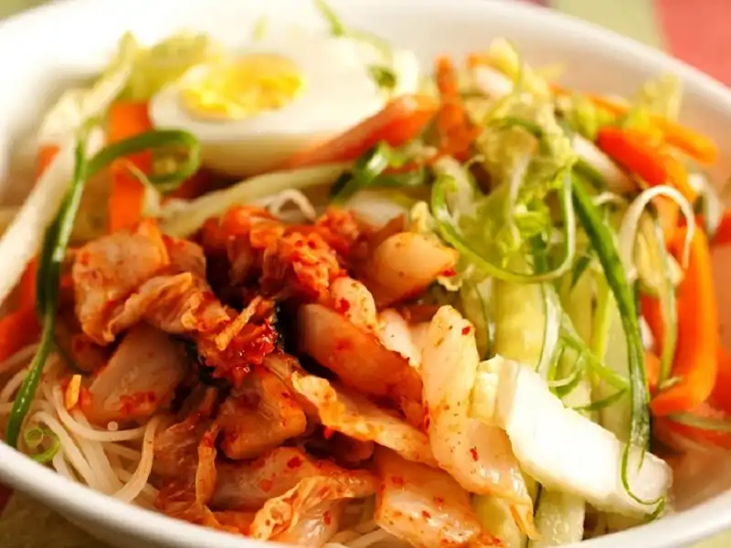 Món mì lạnh rất phổ biến ở xứ sở kim chi. Mì làm từ bột mì được luộc lên rồi trụng vào nước lạnh, sau đó nấu với xốt cay, gochujang, tỏi, dấm, đường, ăn kèm dưa chuột thái lát, dầu mè và trứng luộc. Món ăn có vị chua, cay, ngọt hòa quyện.
