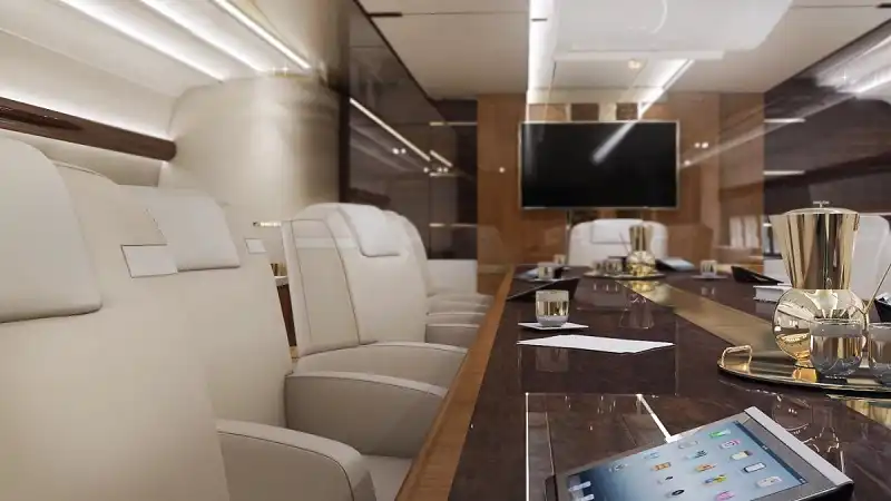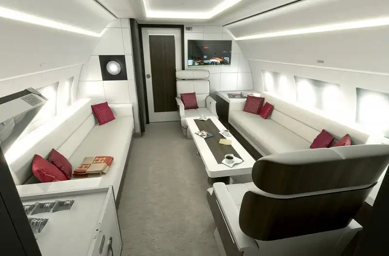 Đây là một chiếc Airbus ACJ319, với không gian dành cho 8 người. Đấy chính là chiếc phi cơ thương mại liên lục địa với cabin rộng nhất và cao nhất.Hãy nhìn những chiếc ghế mà xem!Những khách hàng muốn đổi sang phiên bản Airbus VIP thân rộng sẽ có thêm một phòng họp hoặc một phòng ăn tối.