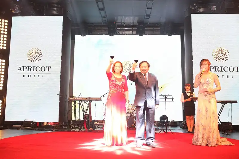 Ông Nguyễn Văn Tuấn và bà Nguyễn Phương Nam nâng ly mừng sự kiện khai trương khách sạn